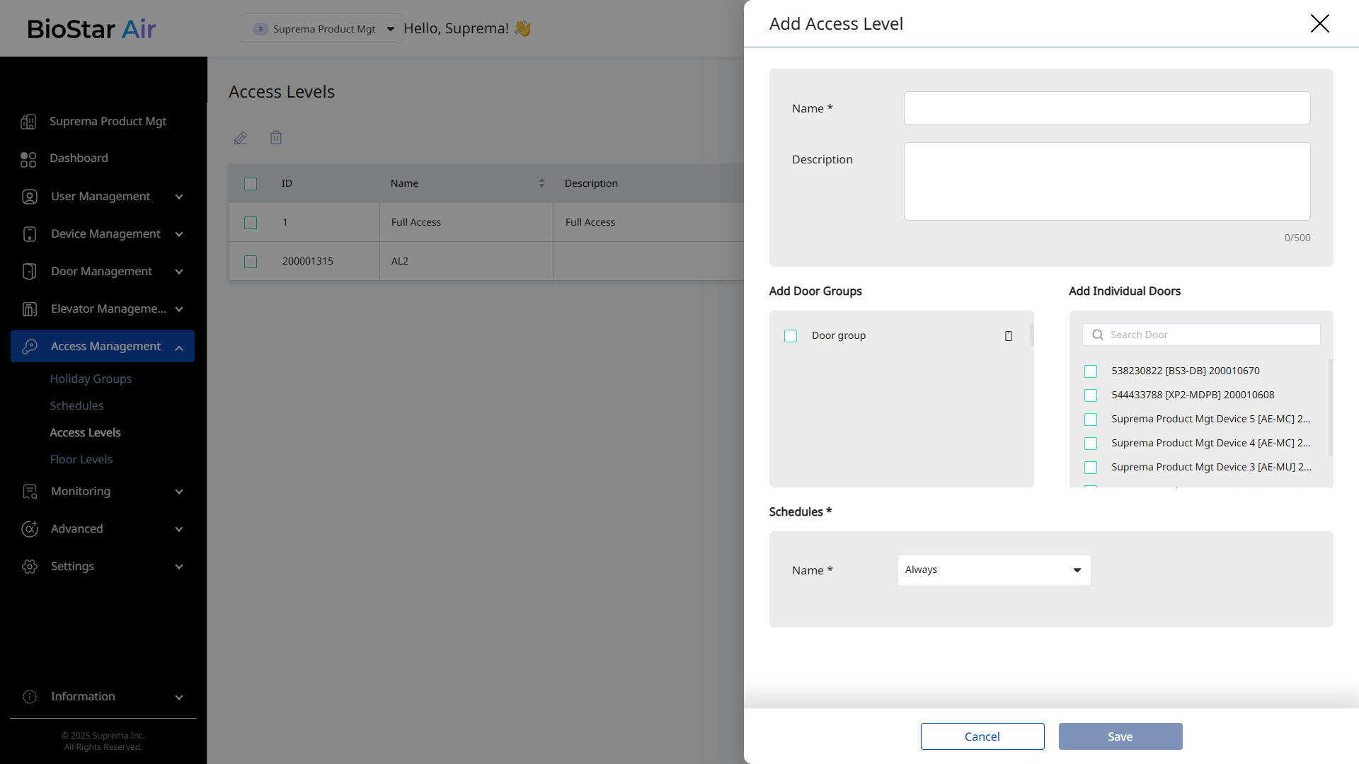 When the Add Access Level panel appears, enter Name and Description (optional).