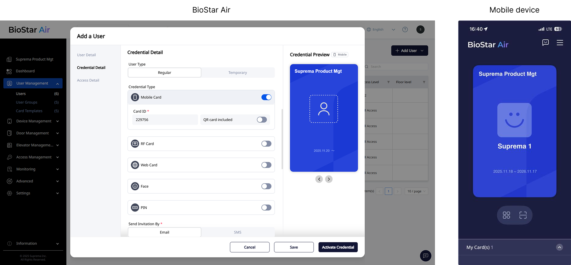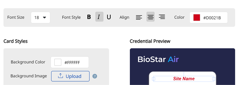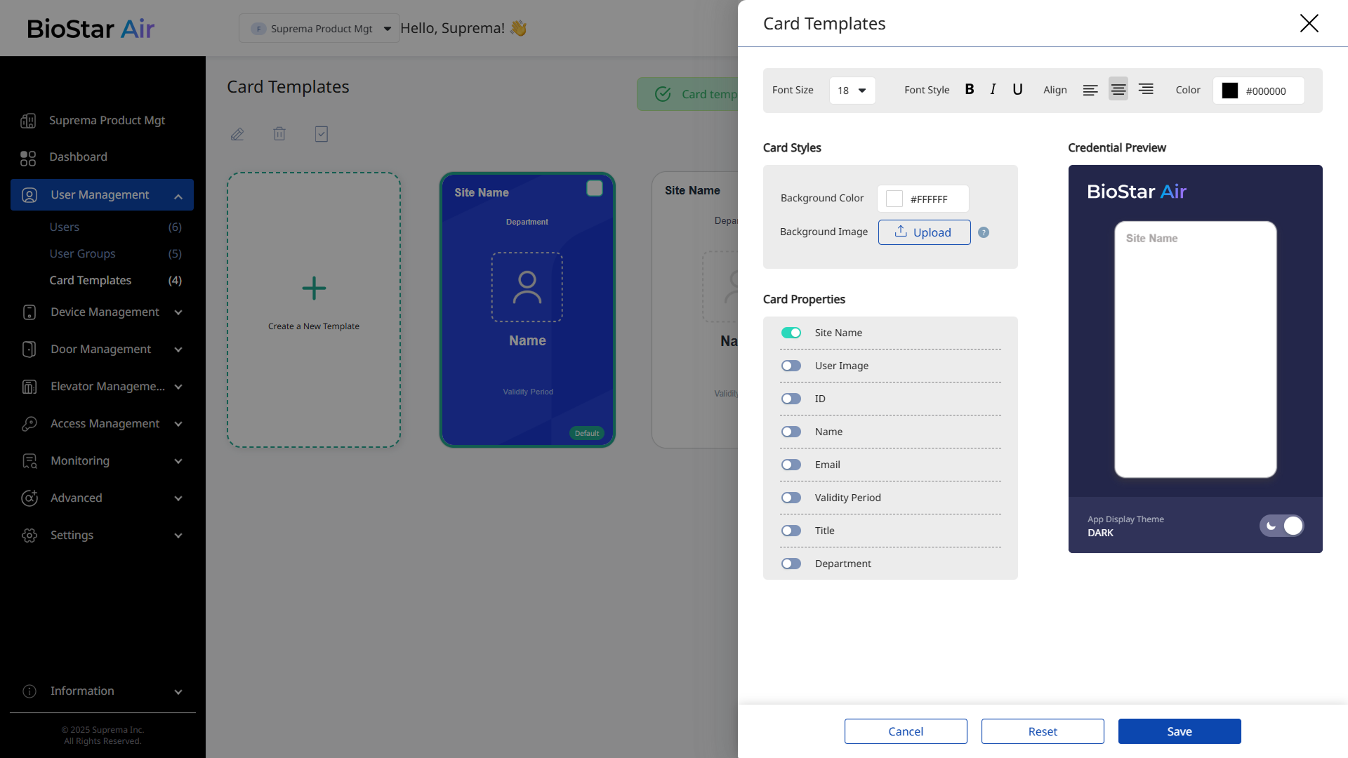 With card templates in BioStar Air, administrators design and customize mobile cards for users. The templates enhance branding by including corporate colors, logos, and personalized details. Card templates apply to mobile cards used in the Suprema Pass app.