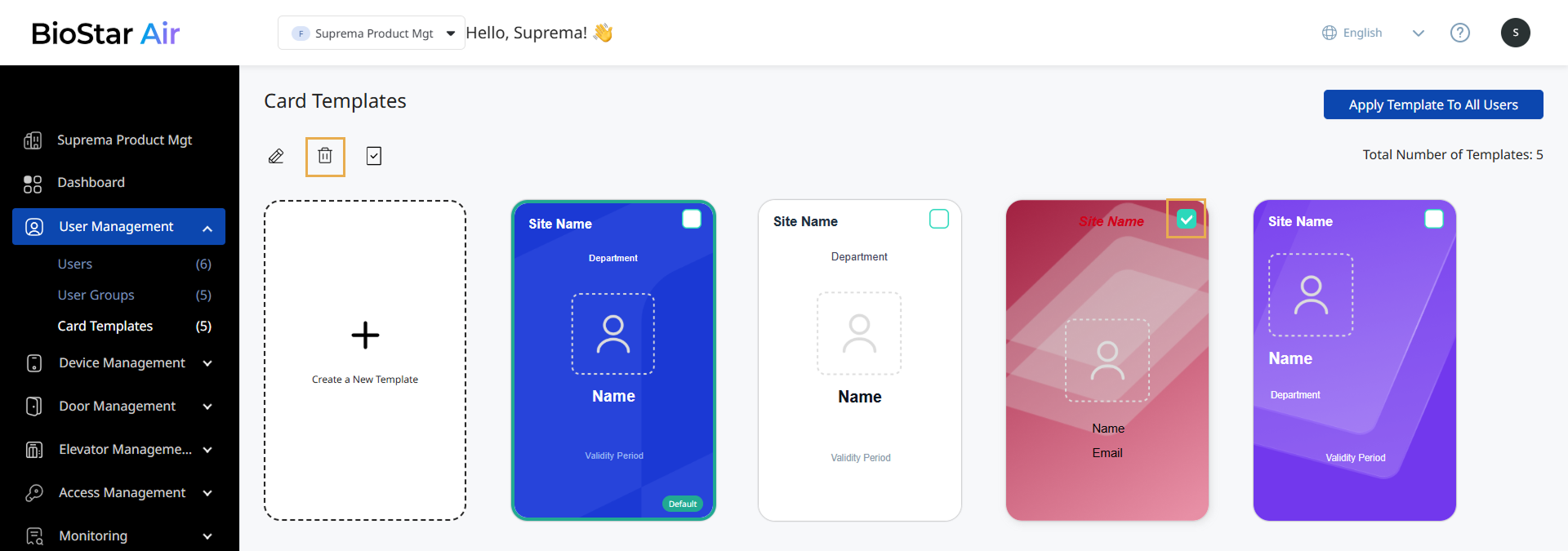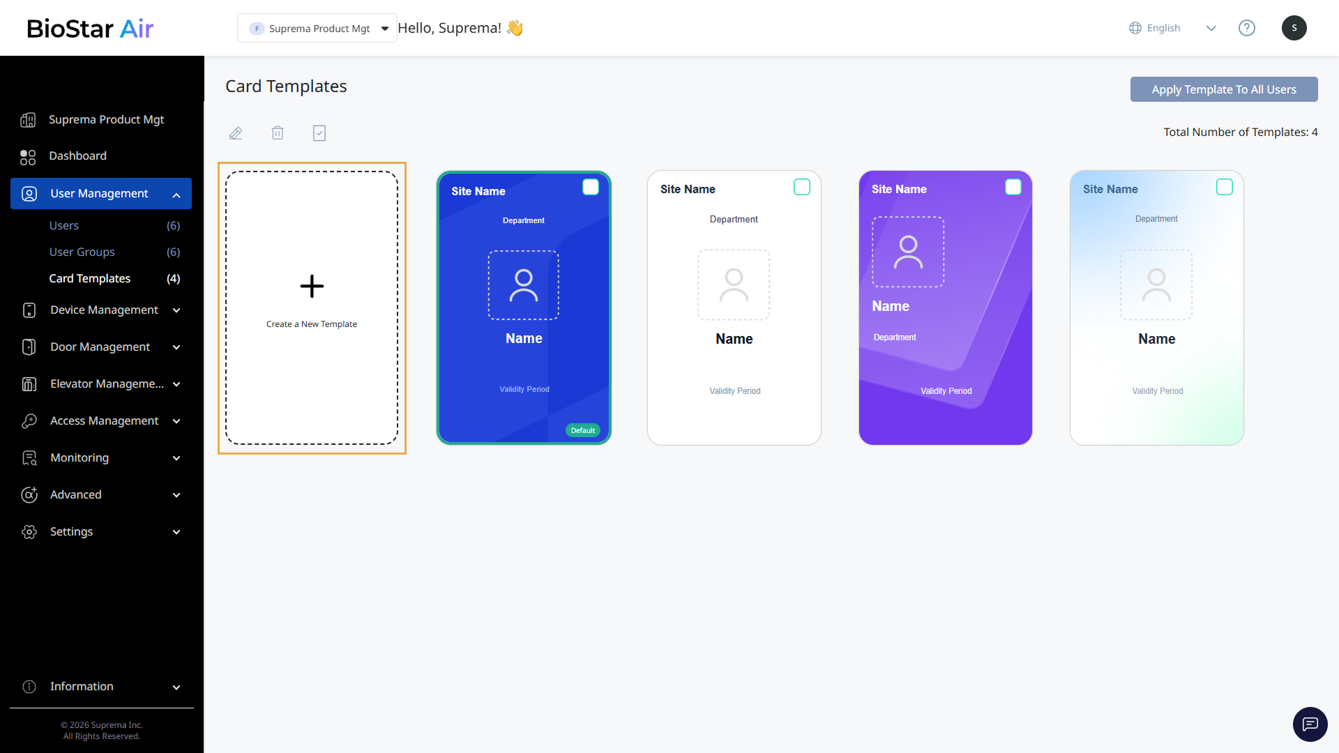Every site in BioStar Air includes default templates. Click User Management → Card Templates in the left sidebar.