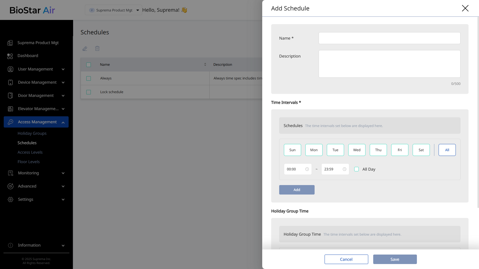 During the scheduled period, the door remains locked and the relay does not trigger. Even if a valid credential is presented, the door cannot be unlocked through authentication. Only a site administrator can manually unlock the door through the BioStar Air Admin portal or mobile app.