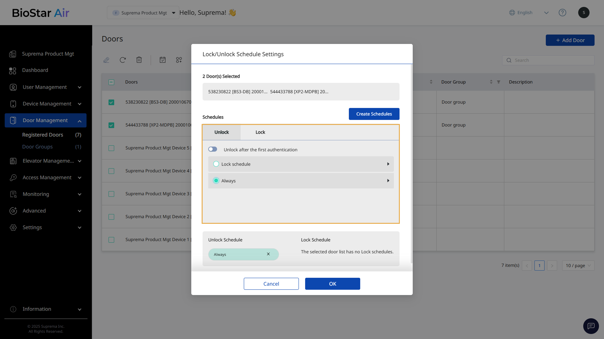 You can set door schedules to automatically lock and unlock doors based on time periods. Configure lock and unlock times, and utilize advanced options such as open after first authentication to set up secure and controlled access.