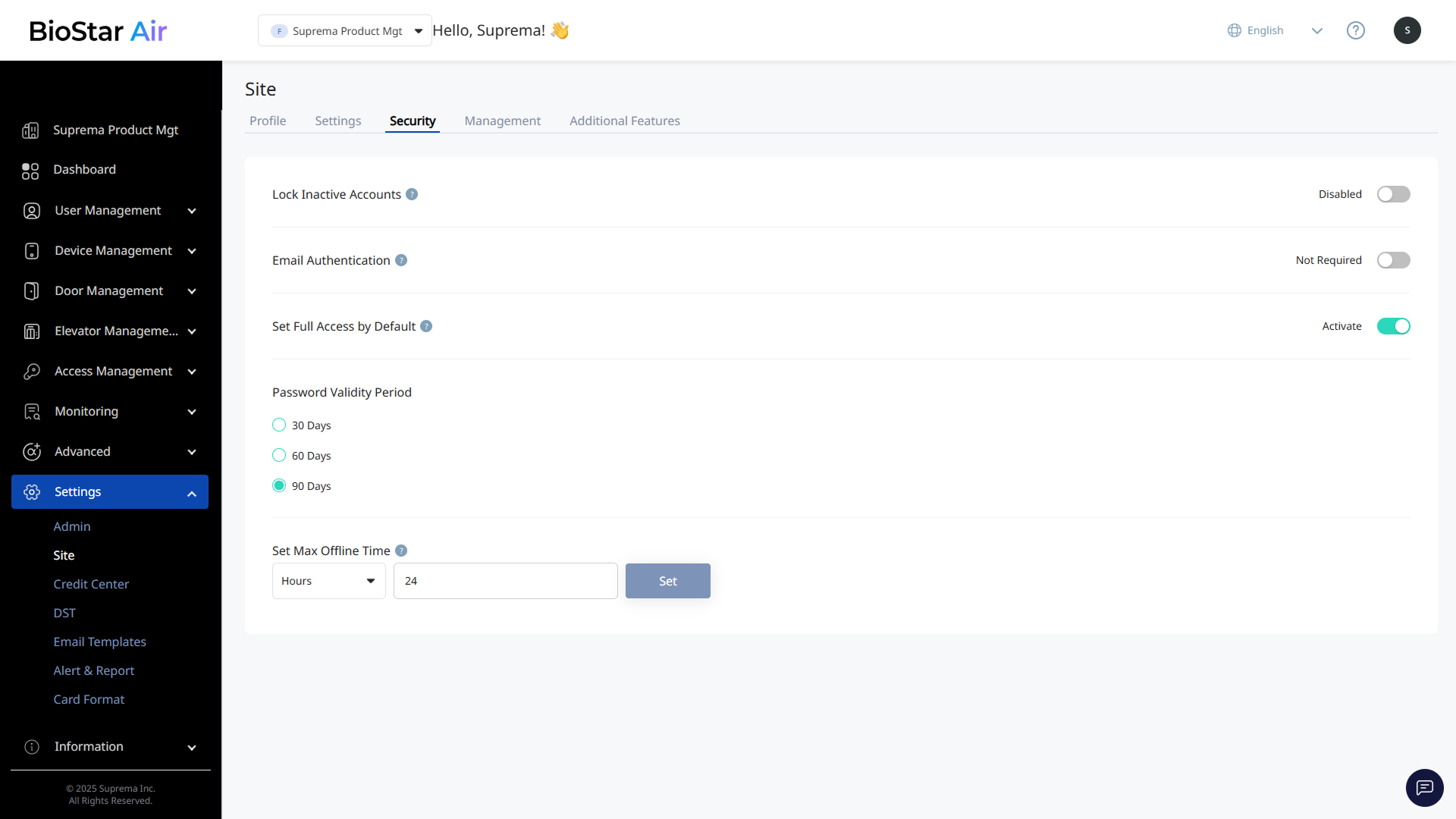 Configure security policies properly to prevent unauthorized access and keep the site secure. You can strengthen site security by locking inactive administrator accounts, enabling email-based 2-factor authentication, and setting password change intervals.