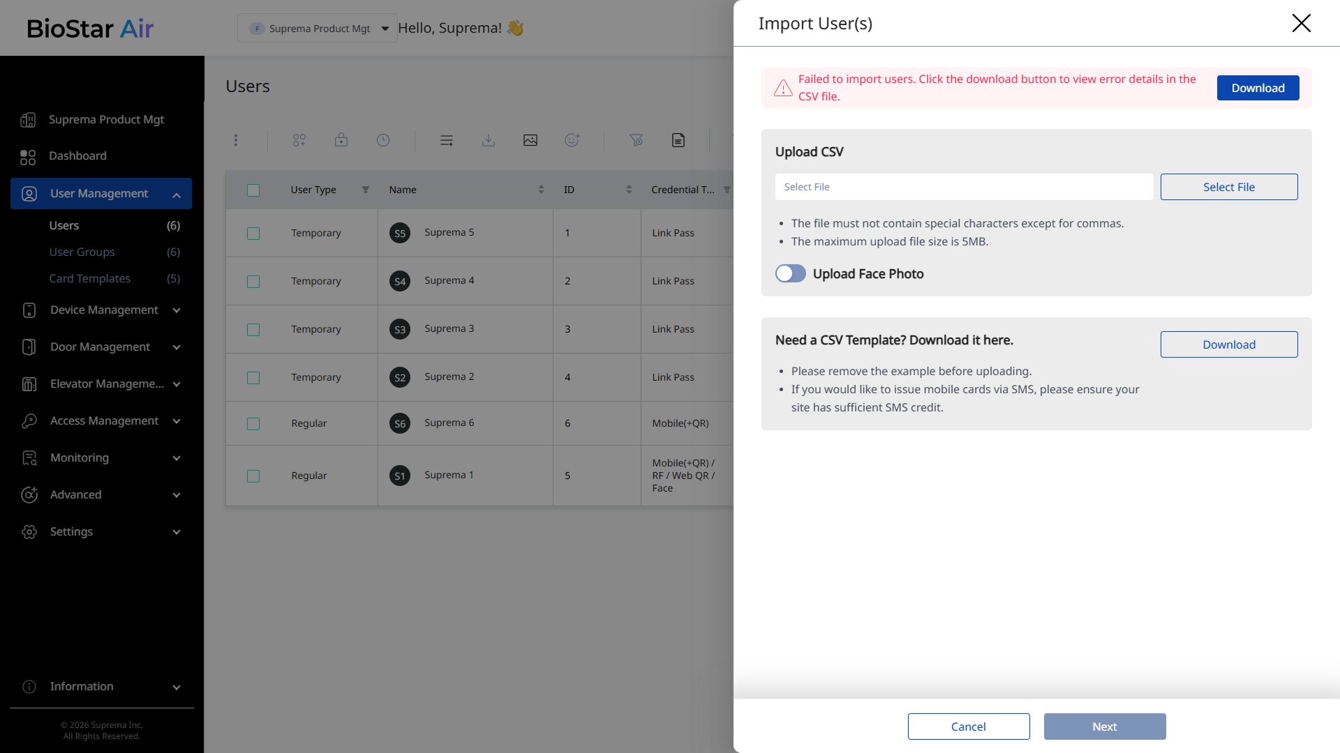 Starting with v2.10, BioStar Air returns a validation report when a CSV file containing invalid entries is uploaded. Correct the errors, and then upload the file again.