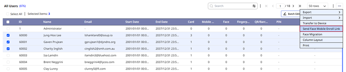 Learn how to batch enroll users' faces. You can enroll faces of multiple users at once by using the import feature with a CSV file or by loading face pictures with file names that match user IDs. Alternatively, you can send face enrollment links via email to multiple users, allowing them to enroll faces directly from their mobile devices.