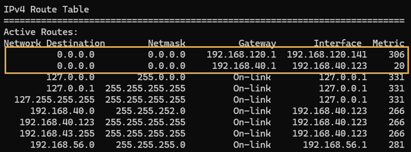 In the above example, the 192.168.40.123 interface has a metric value of 20, resulting in a higher priority.