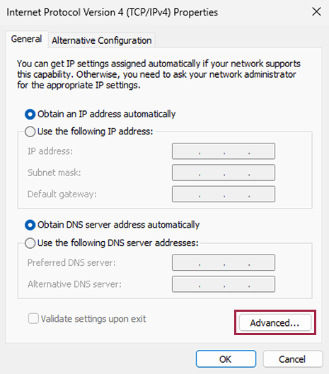 When the Internet Protocol Version 4 (TCP/IPv4) Properties window appears, click the Advanced button.