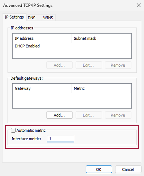 The values you can enter for Interface Metric range from 1 to 9999. The lower the value, the higher the priority.
