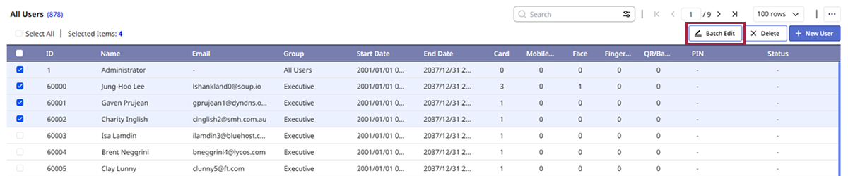 You can edit the information or access permissions of multiple users at once. This feature is useful when setting the same access permissions or groups for multiple users.
