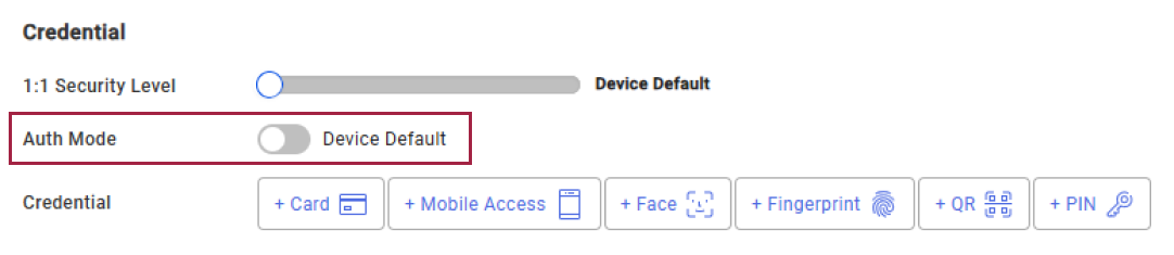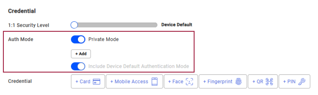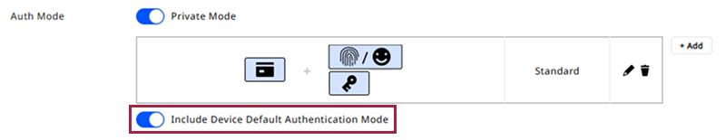 Setting Include Device Default Authentication Mode allows the use of both the authentication modes set on the device and the private authentication modes configured in BioStar X.