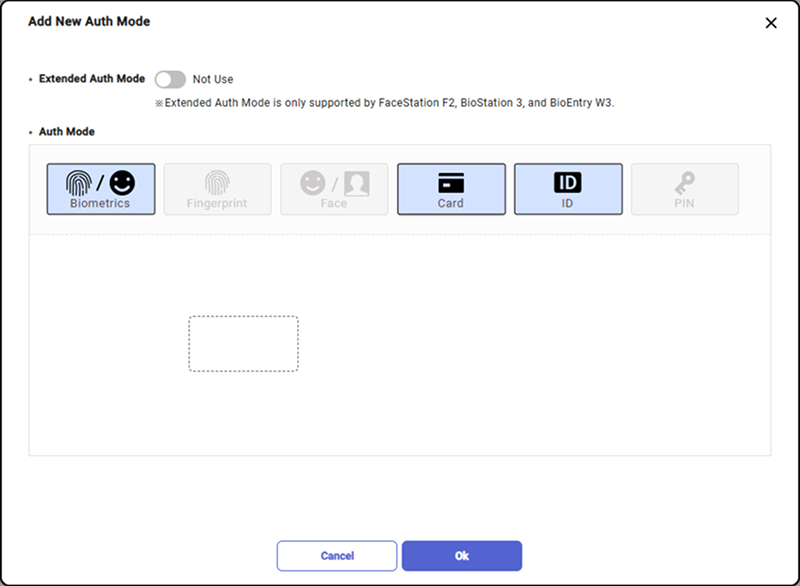 The Extended Auth Mode option is supported on the FaceStation F2, BioStation 3, and BioEntry W3.
