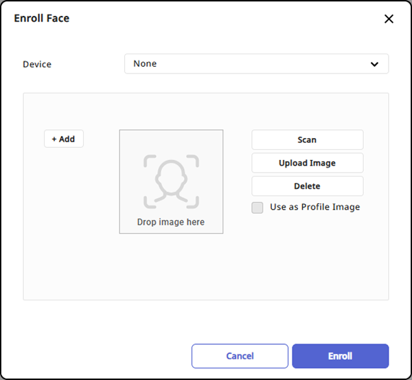 Click + Face in the Credential section. When the Enroll Face window appears, set each item and click Enroll.