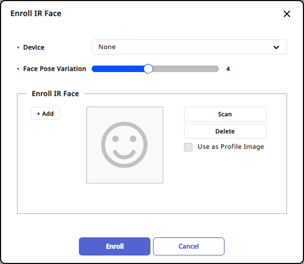 You can enroll the user's face as a means of authentication for access control. IR face enrollment is an authentication method that captures the user's face using an infrared camera.