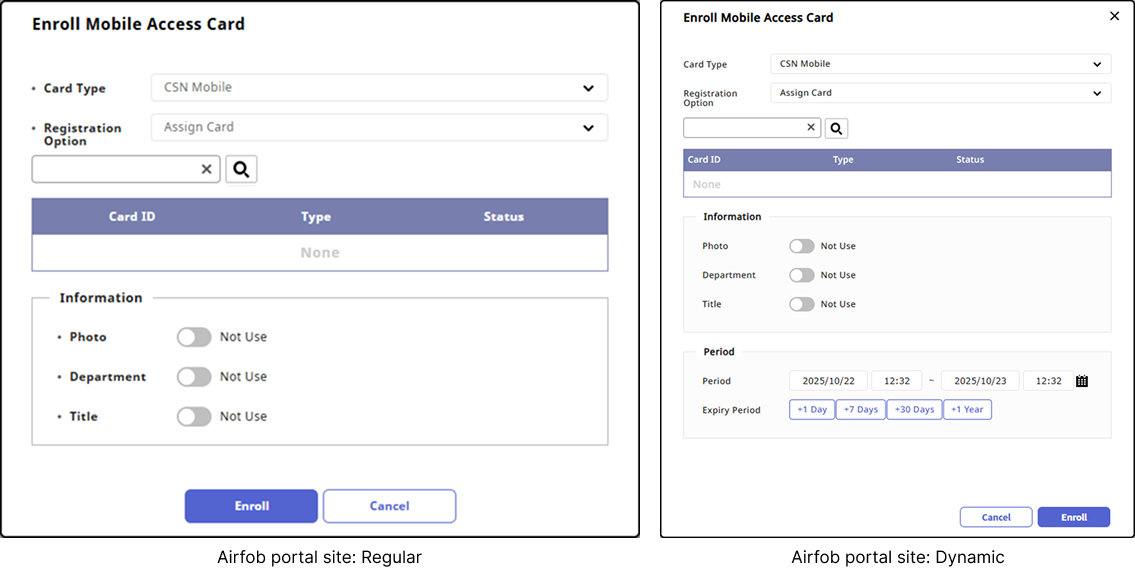 The Period item is activated when setting a dynamic site upon site creation in the AirPop portal. You can set the expiration duration and usage period for the mobile access cards. For more information about the Airfob Portal, refer to the following link.