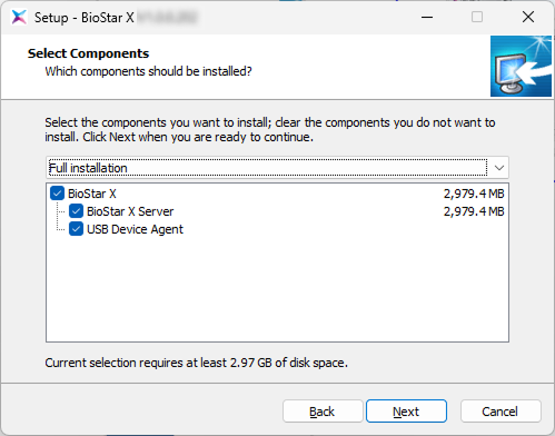 Select the components of BioStar X and click the Next button. If you select USB Device Agent, the USB Agent and driver for using BioMini, BioMini Plus 2, BioMini Slim 2, and DUALi DE-620 will be installed together.