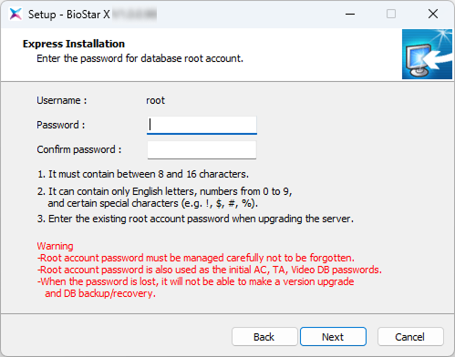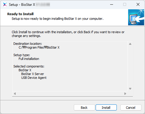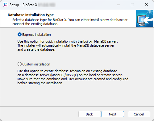 This procedure guides you step-by-step to install BioStar X using Express installation. Express installation automatically installs the embedded MariaDB server and creates the database, allowing for quick installation without separate database configuration.