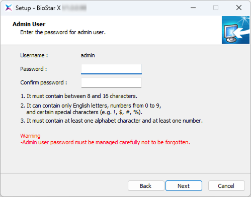 The administrator account password is used when logging in for the first time after installing BioStar X.