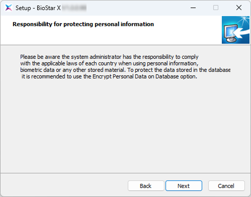 Read the information about the management and responsibility of personal information stored in the database, and click the Next button to continue the installation.