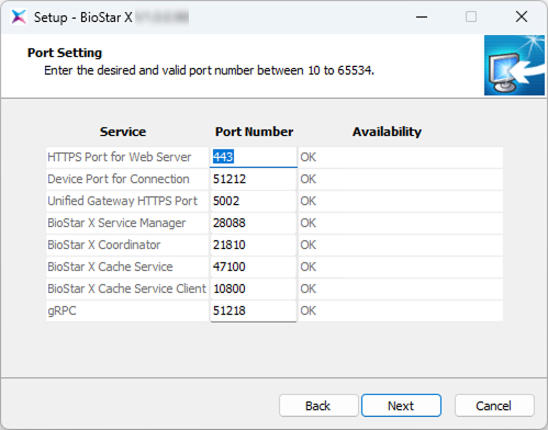 Set the port for BioStar X communication and click the Next button.
