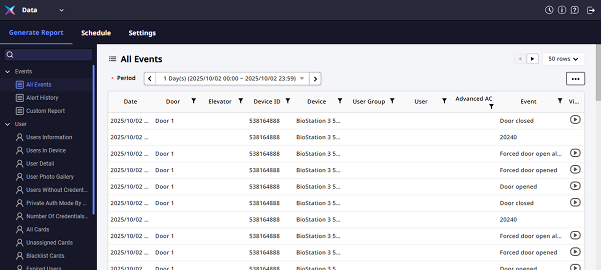 Using the Data menu, you can query user information registered in BioStar X or events that meet specific criteria, and generate reports on a regular schedule. You can automatically generate the desired report on a regular schedule if needed, and the generated report can be exported as CSV or PDF files or printed.