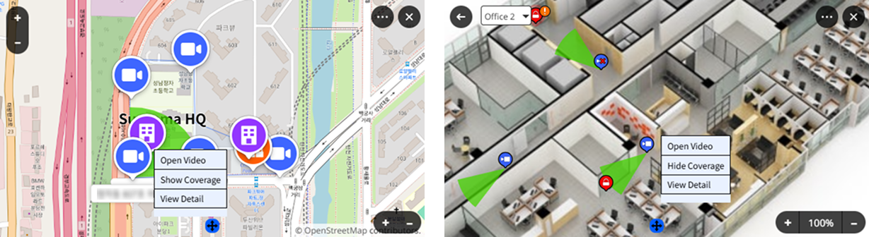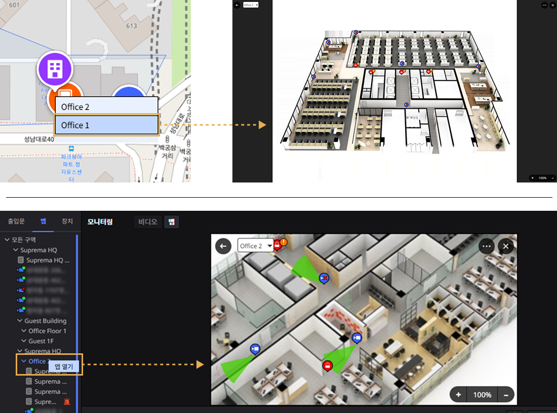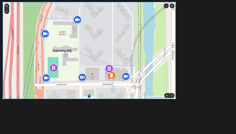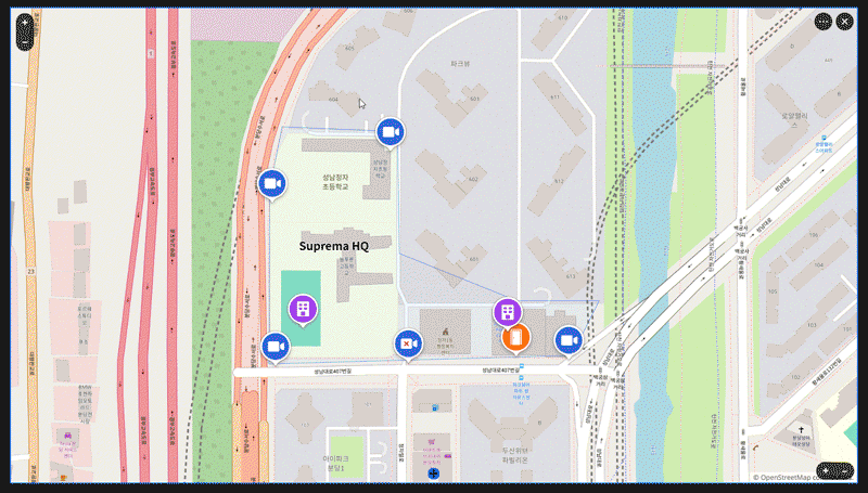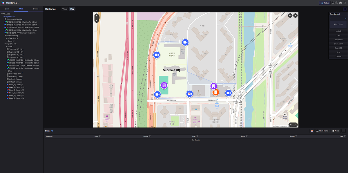 This guide explains how to monitor and control the real-time status of doors and cameras by zone and floor using the map monitoring feature. Map monitoring allows for easy navigation of areas and floors through a visual interface integrated with Google Maps, enabling various features such as access door control and camera video playback.