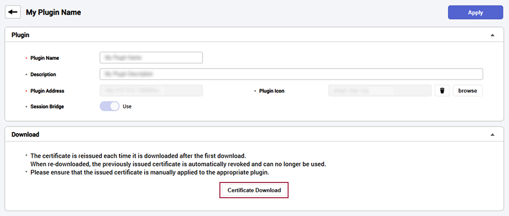 If you have activated Session Bridge, you can download the certificate at the bottom of the screen. The certificate is required for secure communication between BioStar X and the plugin. If you lose the certificate, you can download it again. At this time, the existing certificate will be invalidated.