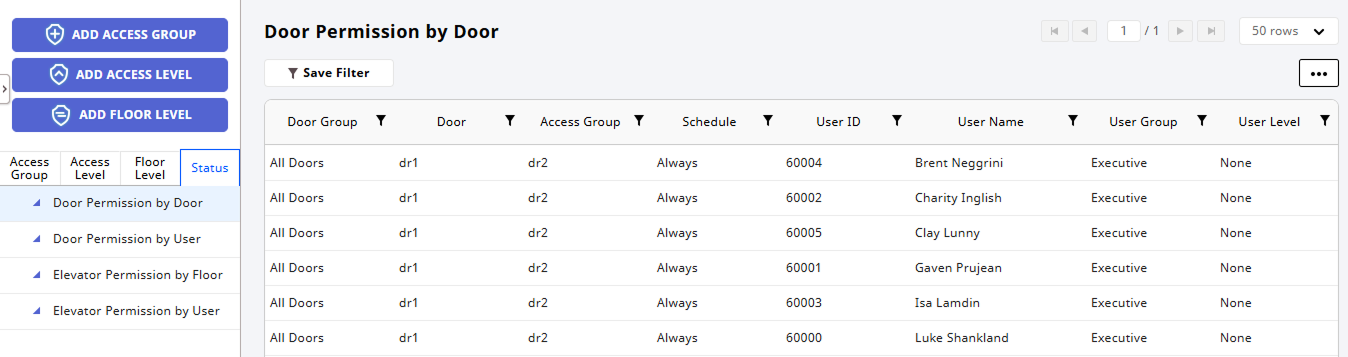 This guide explains how to check the list of doors accessible by users. By checking the access permission status, you can manage the doors a user can access and the permissions for those doors. Use the filter feature to sort the desired results, and you can save the list as a CSV file.