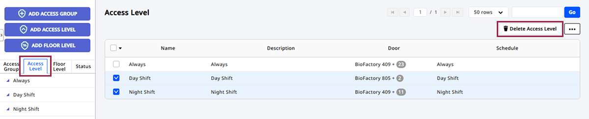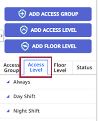 Access levels enable users to set times for entry and grant permission to access doors during those times. Access levels are a key element for configuring access groups.