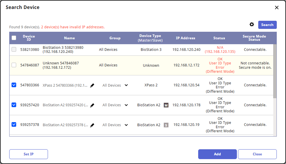 Devices for which the IP address is unavailable or needs to be changed can be modified by clicking Set IP. Refer to the following for more information.