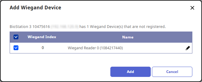 When the list of Wiegand devices connected to the master device appears, select the device to register.