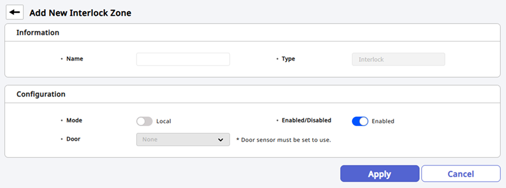 Door: Select the door to be designated as an interlock. You must select at least 2 or more doors, and only doors with connected door sensors can be added.