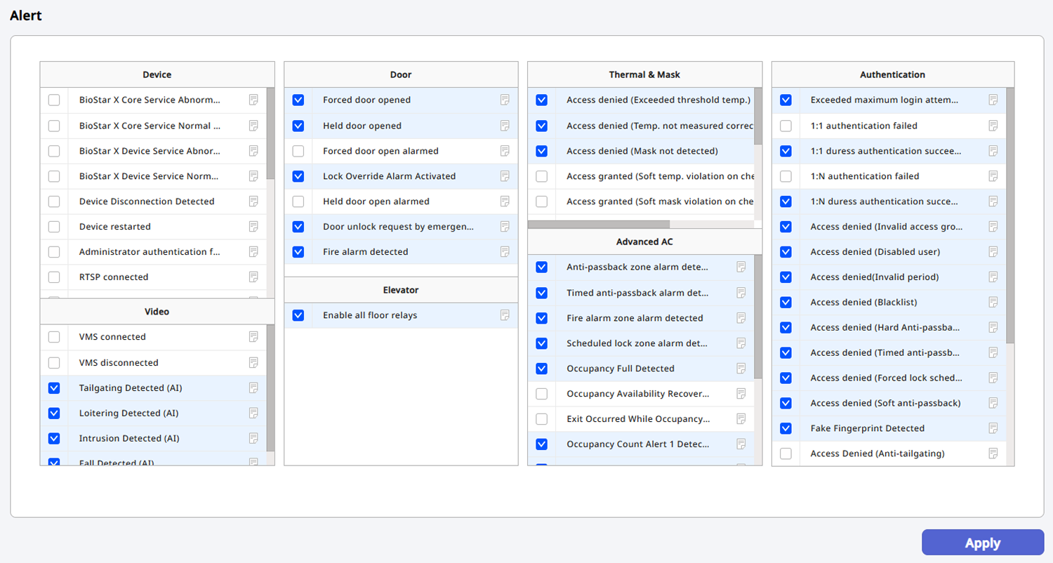 Set the types of alert and messages to appear on the screen when events occur in the device, door, or area. Additionally, you can configure it to play a sound file uploaded by the user when the alert occurs.
