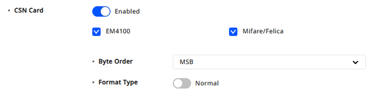 Wiegand: Transforms and expresses the card's serial number (CSN) according to user-defined Wiegand format. For information about how to set a new Wiegand format, refer to the following.