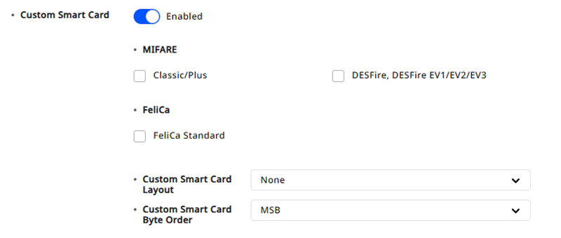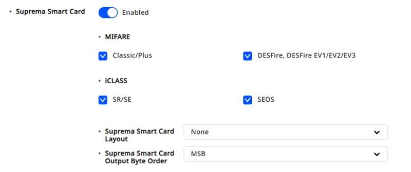 Select the types of Suprema smart cards and set the card layout and byte order.