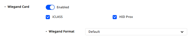 Select the types of Wiegand cards and set the Wiegand formats. Choose the Wiegand format to be used in the Wiegand Format option.