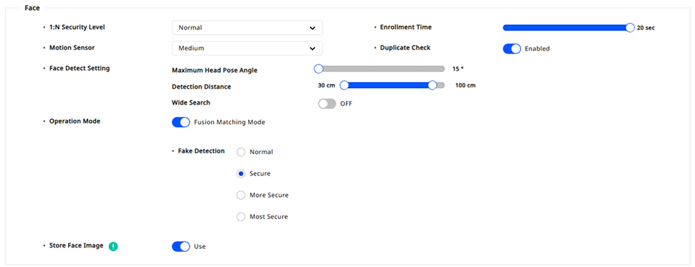 Fake Detection: Prevent user authentication using fake faces such as photos. This is activated when the Operation Mode option is set to Fusion Matching Mode.