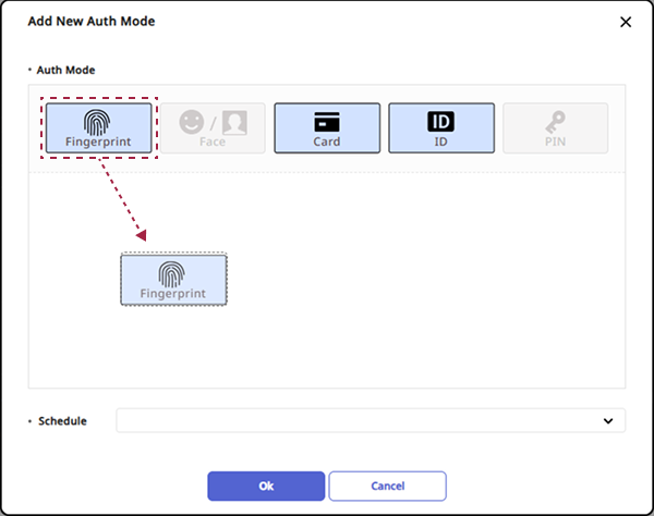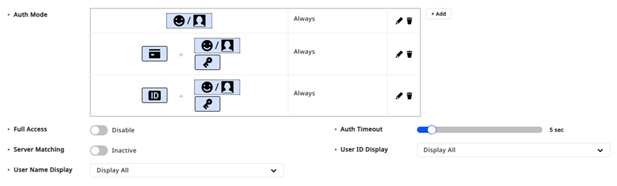 Set the device's authentication mode in the Auth Mode option. You can configure the authentication mode by combining credentials such as fingerprint, ID, card, PIN, and face.