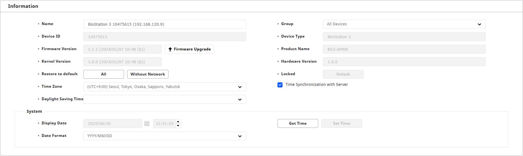 Time Synchronization with Server: You can synchronize the device's time information with the BioStar X server.