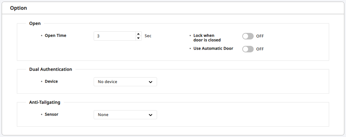 Use Automatic Door: If using an automatic door as the door, the relay can operate regardless of the door sensor's status. If set to Lock when door is closed, the option cannot be used.