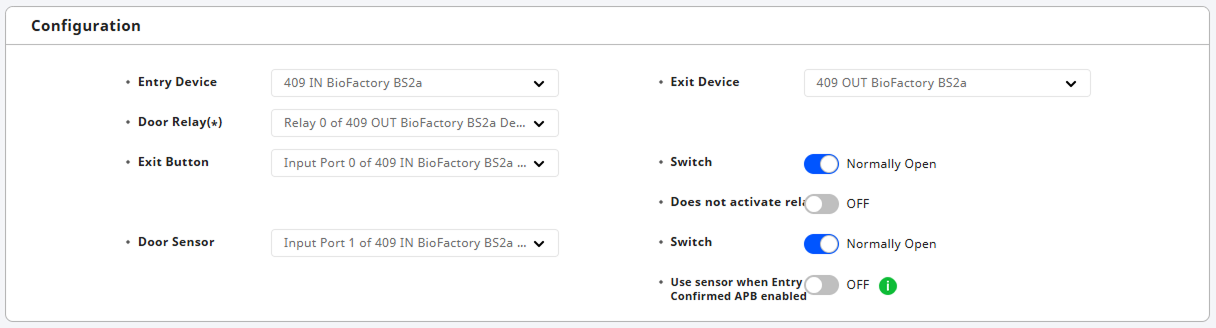 In the Configuration section, you can set the devices connected to the door, exit buttons, and door sensors.