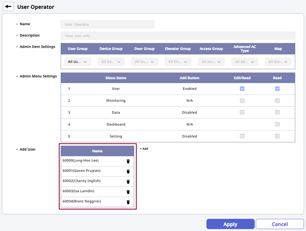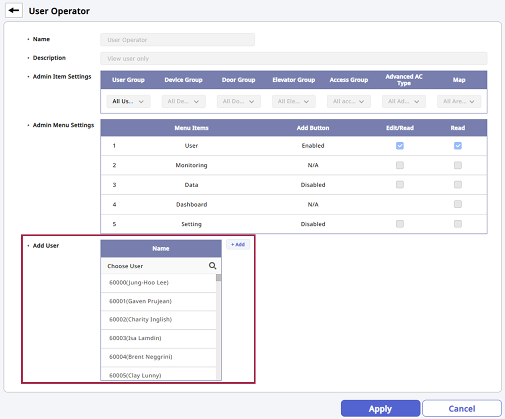 Operator permissions can also be granted when adding or modifying user information. Please refer to the following for details.