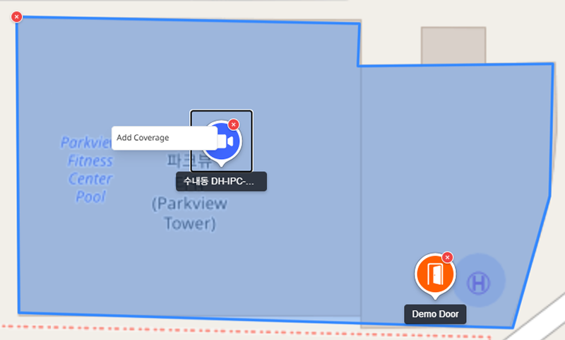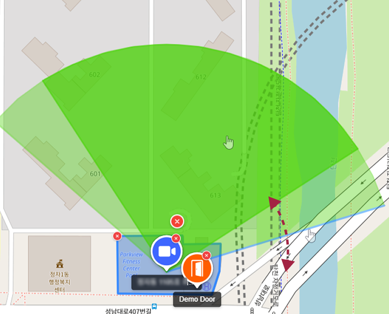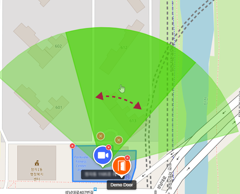 The positions of the added facilities, entrances, and cameras can be changed via drag-and-drop on the map.