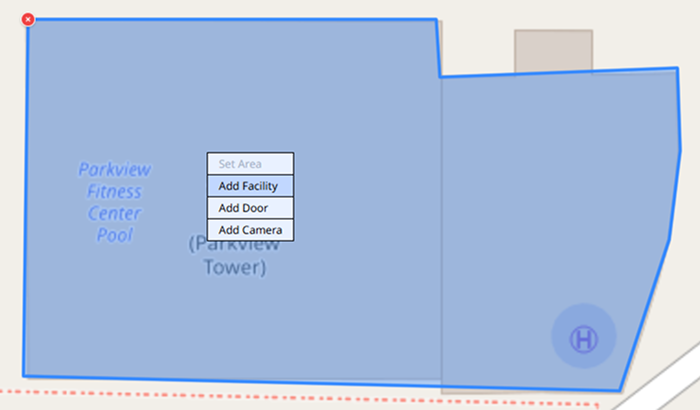 Click the facility, entrance, or camera you want to delete on the map. The icon will appear. Click the icon to delete the selected facility.