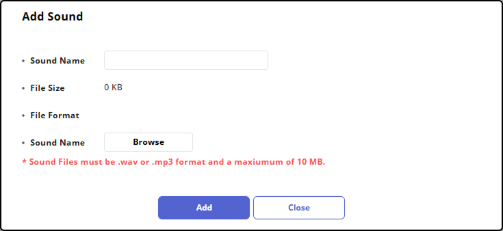 Only .wav or .mp3 file formats can be uploaded for sound files.