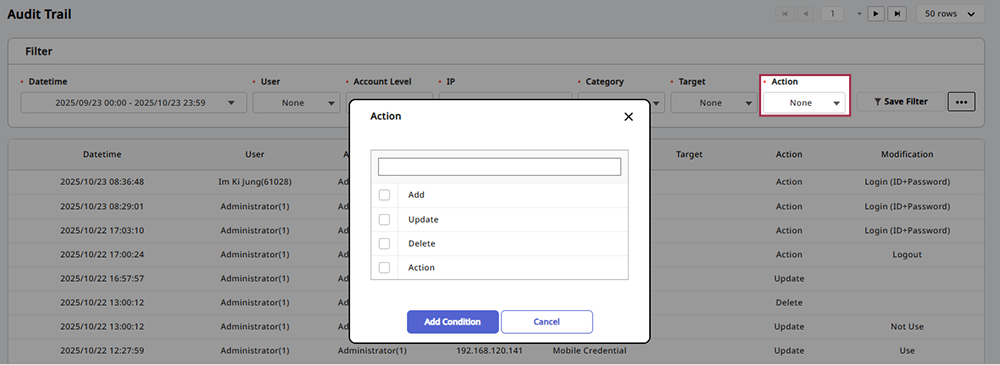 Click Action option in the Filter section to categorize audit trails by the following action types.