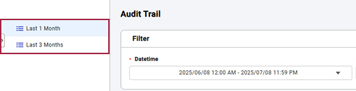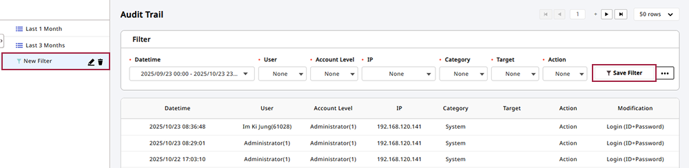 In the Filter section, you can set the following options. Filter options match the column items of the audit trail list. However, the Modification column cannot be filtered.