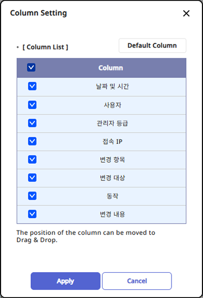 You can change the positions of columns or hide them in the audit trail list. Click → Column Setting on the far right of the Filter section.