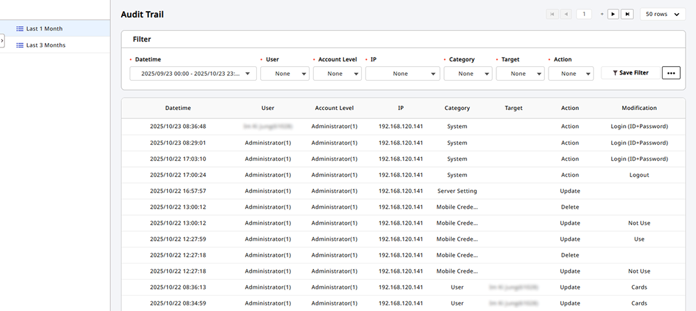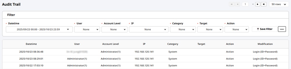 The Audit Trail feature records and tracks all activities occurring in the system. All activities such as user login/logout, setting changes, and system administration tasks are recorded and can be utilized for security audits and system monitoring.