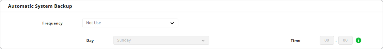 Weekly: Automatically backs up weekly. Set the day to automatically back up in the Day option, and set the backup time in the Time option.