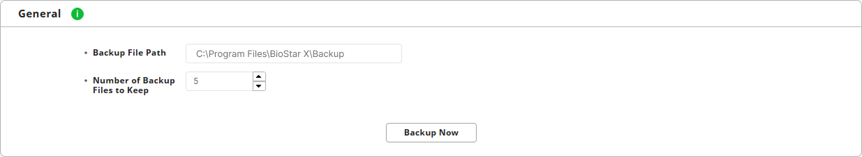 Backup files are saved in zip format at the path specified in the General section's Backup File Path option. The file name is generated in the format BioStar_X_Backup_YYYYMMDD_HHMMSS.zip. Here, YYYYMMDD represents the backup date, and HHMMSS represents the backup time.