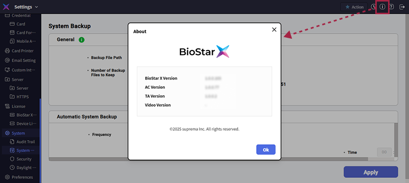 Restoration cannot proceed if the version of BioStar X at the time of the backup is different from the current version. To check the version of BioStar X, click the button at the top right of the screen.